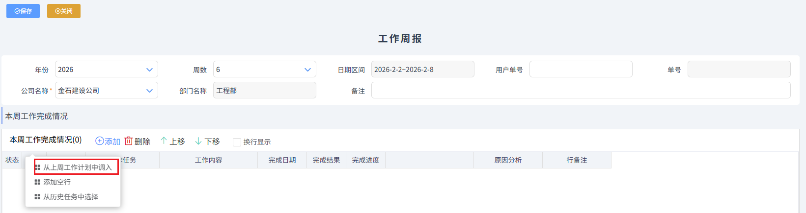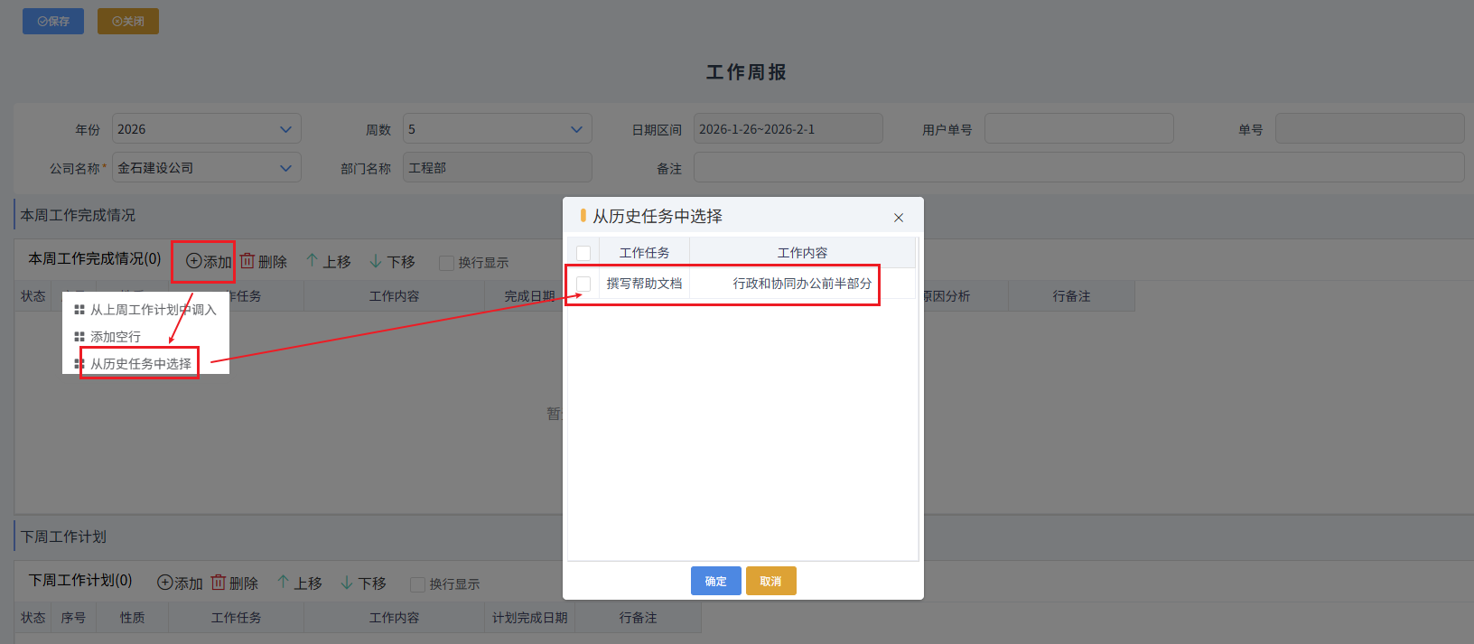 年份默認為本年度,周數會顯示本年度所有周數,如26年會顯示1~52周,公司名稱需要手動選擇。注意上圖中的工作周報若本周的工作任務沒有完成,那么新的一周的工作周報,可以直接調取未完成的歷史任務。如下圖所示: