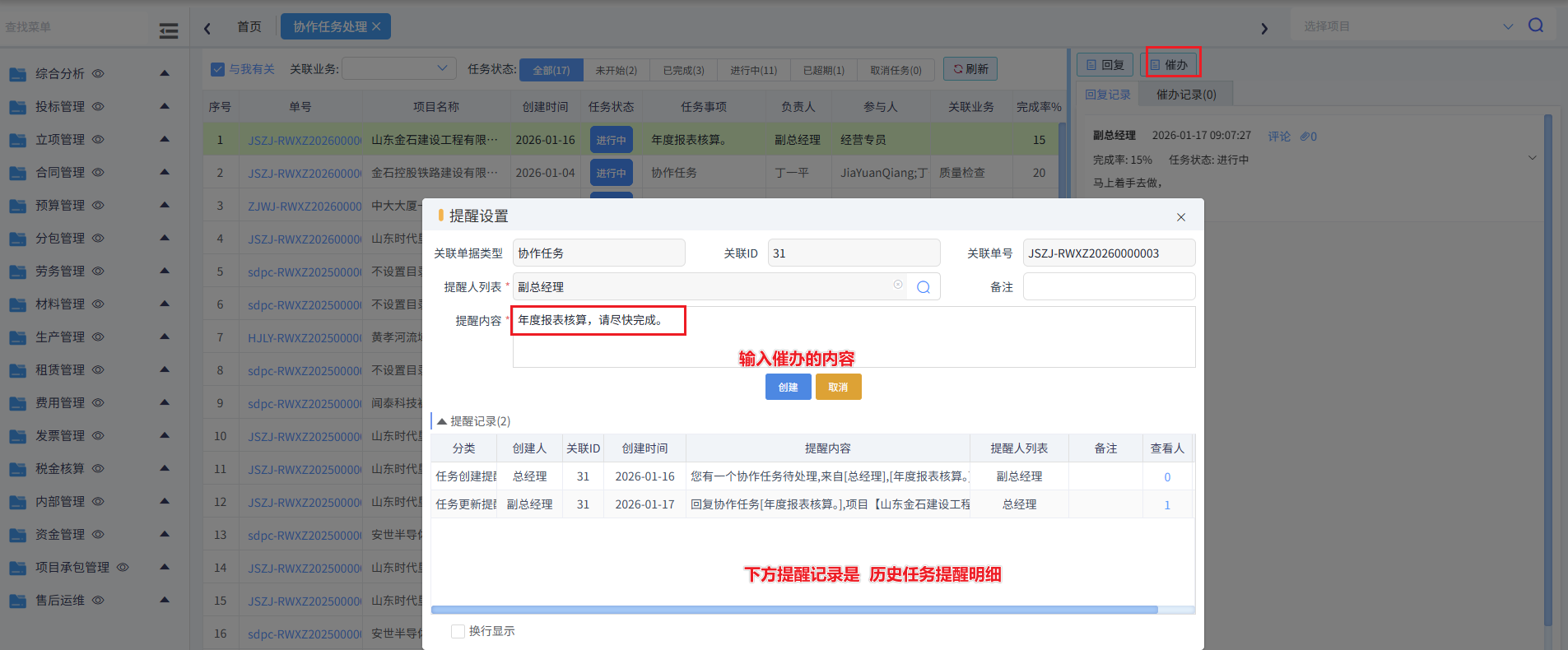 此時任務發起人,也可以對此任務進行催辦,如下圖所示: