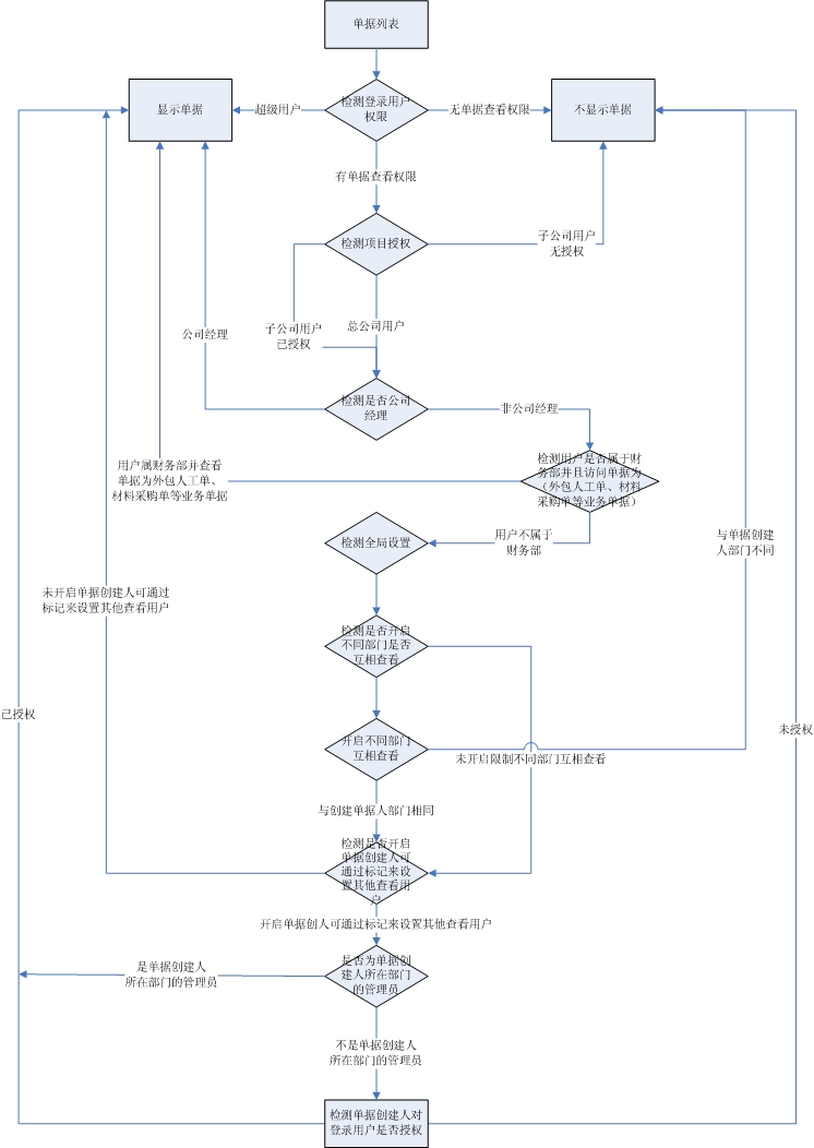 (2)材料采購單、材料銷售單、材料退貨單、外包人工單、外包機械單、運輸車輛單、租賃結算單、其它費用單、設備采購單、設備維修單、設備退貨單、付款申請單、付款單、收款單 (涉及財務的這14個單據) 對于【財務部】也不受該條件限制,可以查看所有部門單據。
