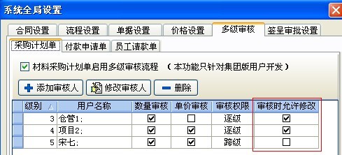 (1) 在采購計劃單、付款申請單、員工請款單中的多級審核設置中,如下圖: