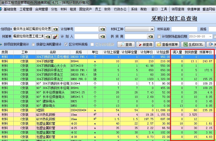 分析:公司給項(xiàng)目代購和調(diào)撥的主材費(fèi)通過【材料管理】-【采購計(jì)劃執(zhí)行匯總】來核對得出,(調(diào)入量+到貨量)*預(yù)算單價(jià)。如下圖: