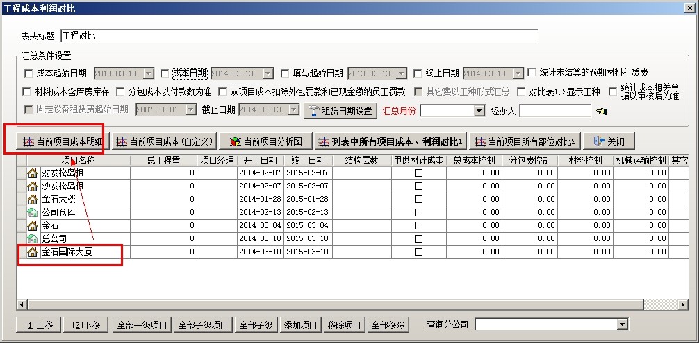 打開項(xiàng)目成本利潤(rùn),選擇要查詢的項(xiàng)目,點(diǎn)擊當(dāng)前項(xiàng)目成本明細(xì)(也可以在系統(tǒng)全局設(shè)置中自定義項(xiàng)目成本利潤(rùn)表,在查看成本利潤(rùn)的時(shí)候,選擇第二項(xiàng),當(dāng)前項(xiàng)目成本(自定義))
