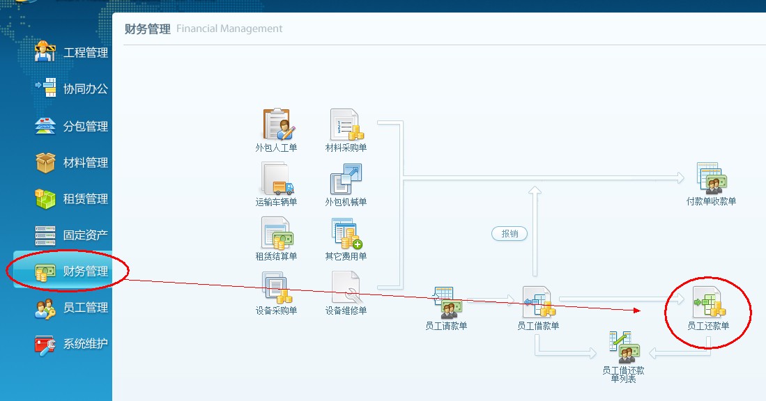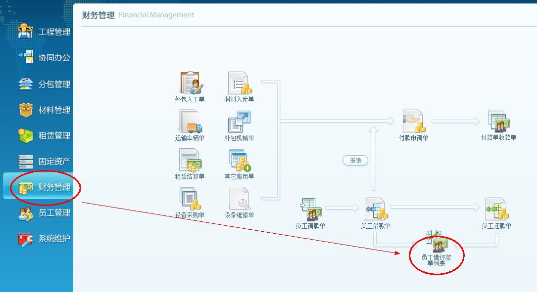 4、下面查詢一下業(yè)務(wù)員借款,點(diǎn)擊財(cái)務(wù)管理,打開員工借還款單列表