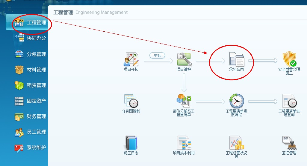 3、如果是項(xiàng)目中標(biāo), 項(xiàng)目新建之后,接著建立承包合同,打開工程管理,點(diǎn)擊承包合同